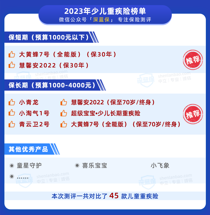 為了幫助大家挑選到高性價比的產(chǎn)品,我們仔細對比了45款少兒重疾險,得出了少兒重疾險榜單,共分為兩部分: