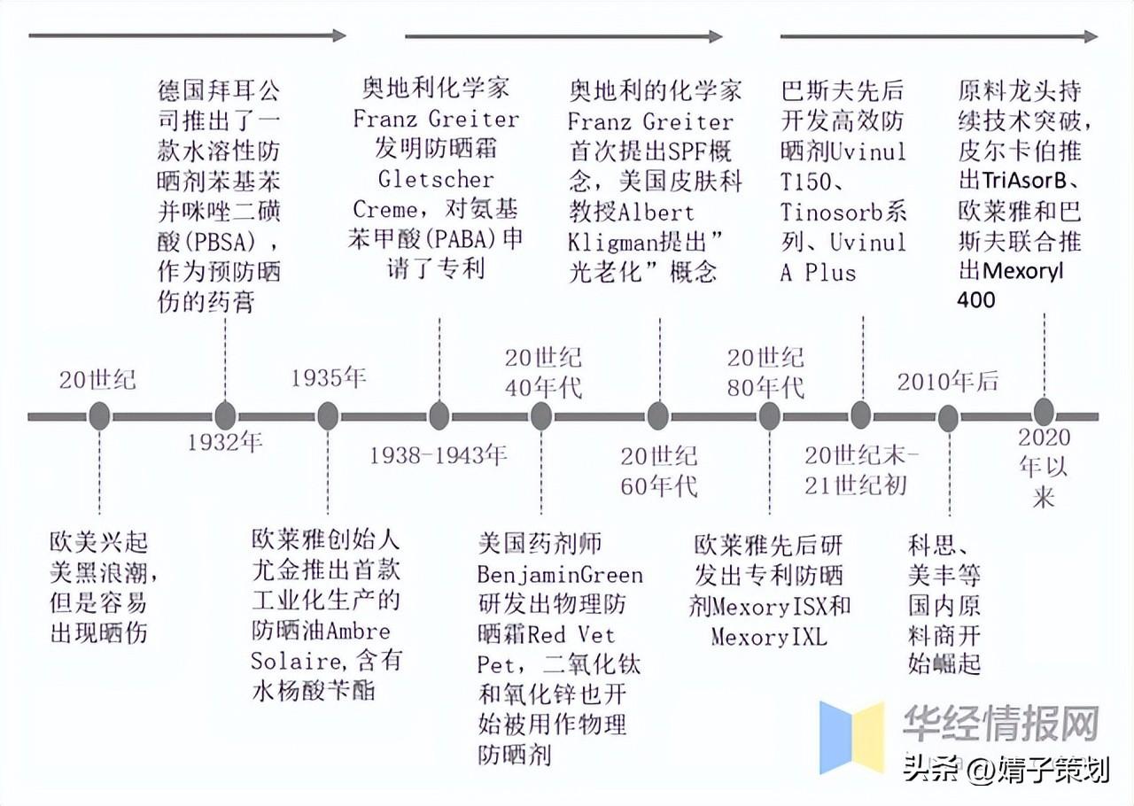 世界防曬劑自20世紀(jì)30年代以來(lái)快速發(fā)展,由于歐美對(duì)于美黑的熱潮,初的防曬劑主要是防UVB,用于在美黑的同時(shí)防曬傷。隨著對(duì)于防UVA和物理防曬劑認(rèn)識(shí)的提升,各類防曬劑類型不斷豐富。20世紀(jì)80年代以來(lái),多款具有更高能的防曬劑(例如更高防護(hù)能力、覆蓋波段更廣、更強(qiáng)穩(wěn)定性、更強(qiáng)相容性、更大分子量)相繼面世。在巴斯夫、帝斯曼、歐萊雅等龍頭原料商引領(lǐng)下,防曬劑技術(shù)得到不斷突破。