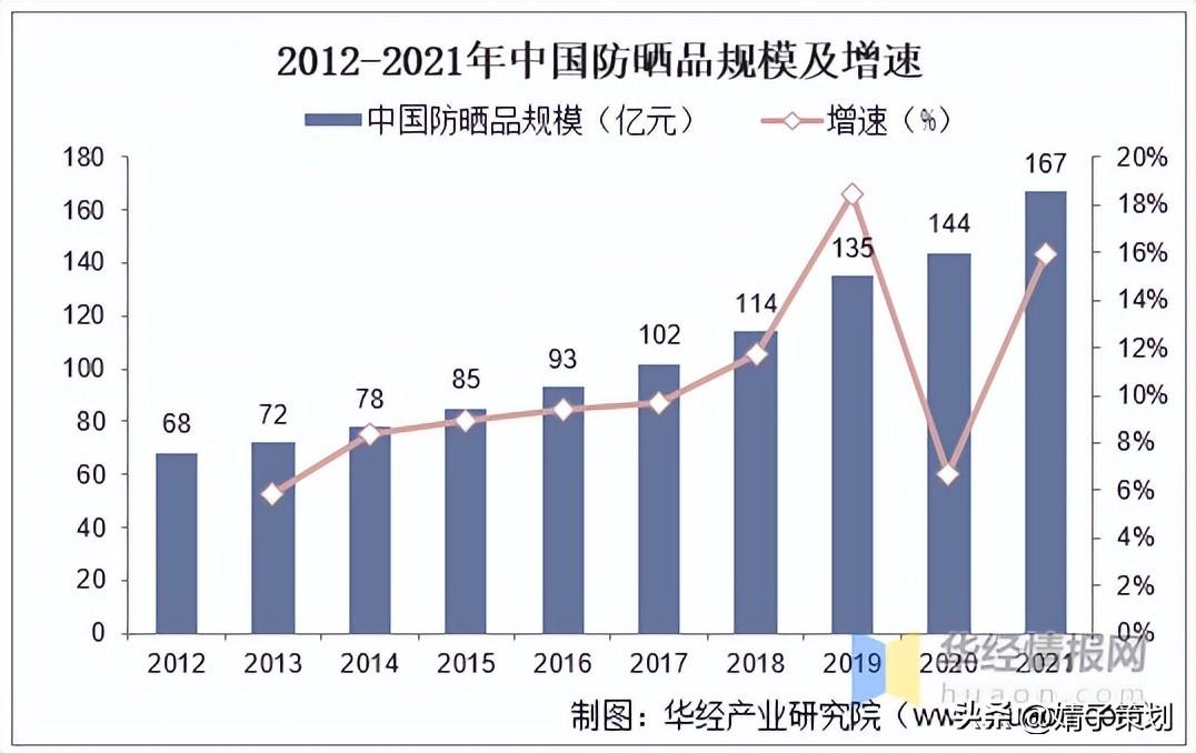 數(shù)據(jù)顯示,2012-2021年中國(guó)防曬品市場(chǎng)規(guī)模呈現(xiàn)逐年上漲趨勢(shì),10年間CAGR為10.5%,2021年市場(chǎng)規(guī)模達(dá)167億元。中國(guó)防曬品規(guī)模增速遠(yuǎn)超,防曬品需求景氣度較高。
