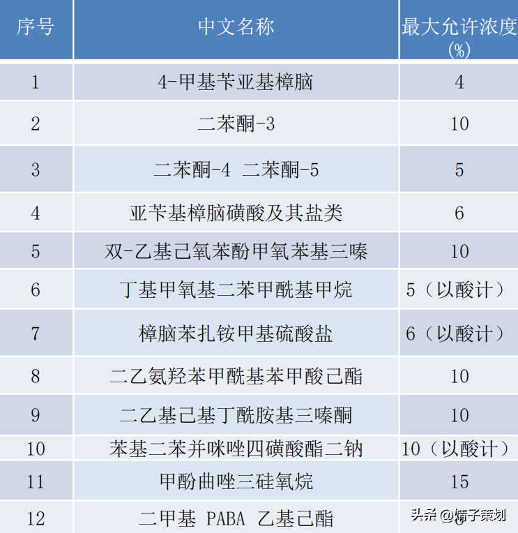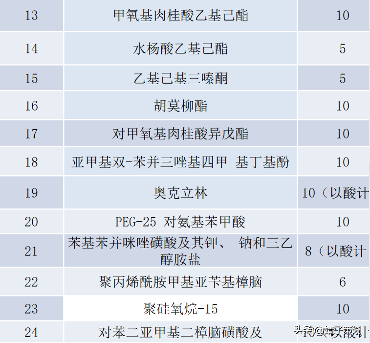 1.不得宣稱“高倍防曬”;2.化學(xué)防曬劑≦3種;3.物理防曬劑總量≦25%;4.SPF值≦30
