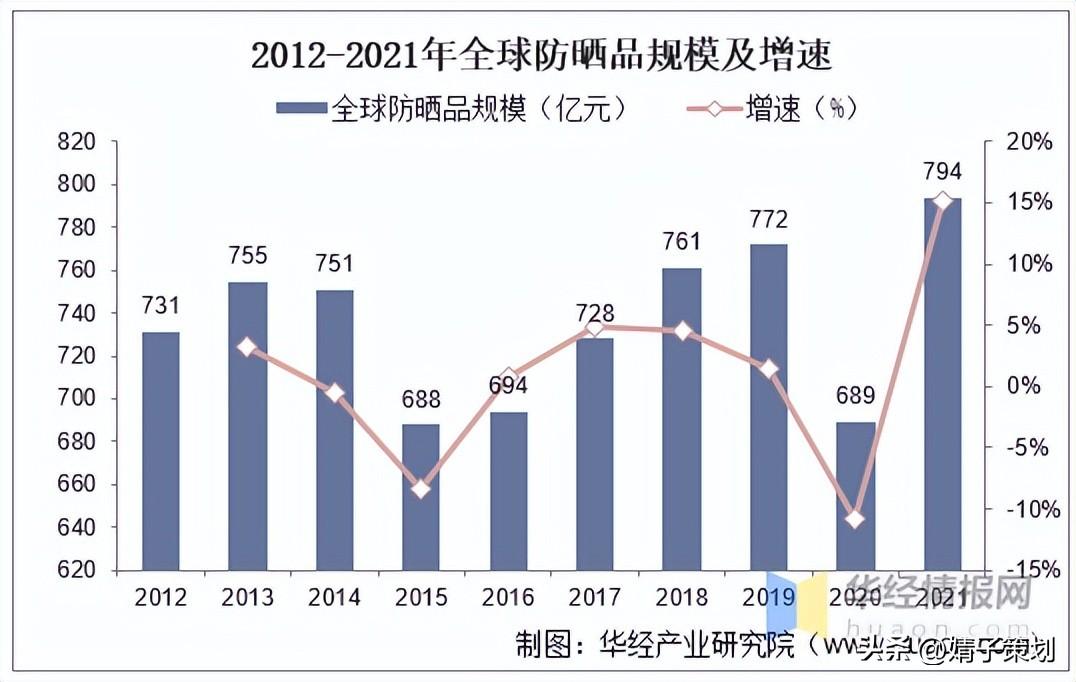 2012-2021年中國(guó)防曬品規(guī)模及增速