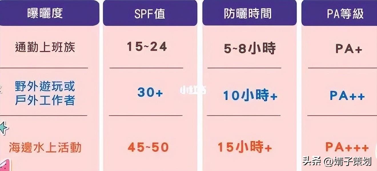 針對(duì)一般環(huán)境選擇防曬產(chǎn)品的建議SPF值與PA等級(jí):