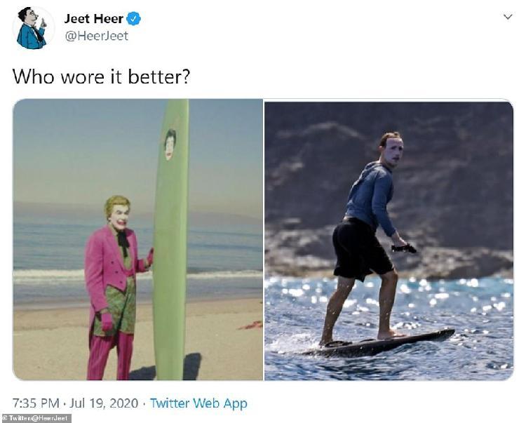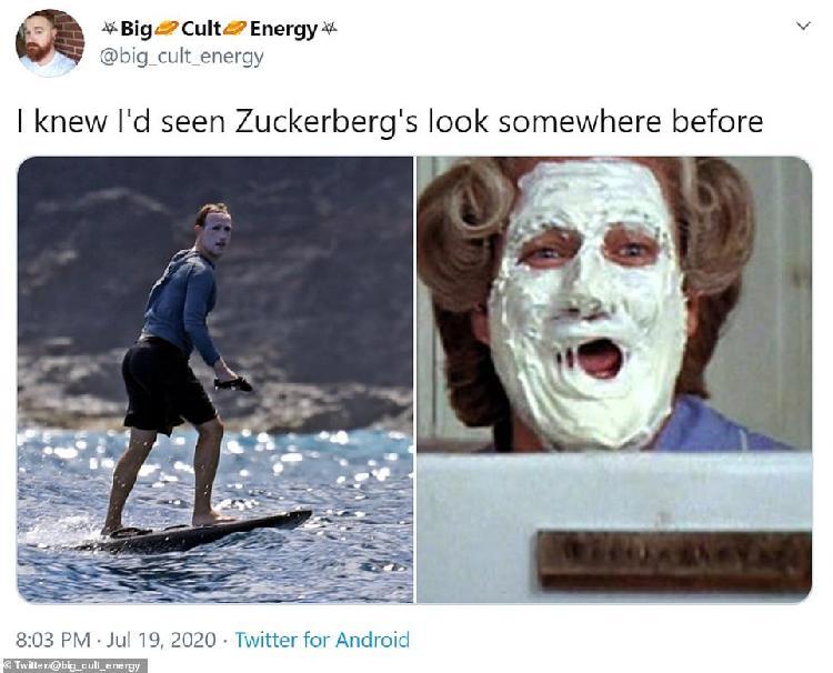 據(jù)英國《每日郵報(bào)》20日?qǐng)?bào)道,美國社交服務(wù)網(wǎng)站臉書(Facebook)執(zhí)行官(CEO)馬克·扎克伯格近日來到夏威夷沖浪。因他臉上涂著厚厚的防曬霜,并穿著藍(lán)色連帽衫防曬,網(wǎng)友笑稱其預(yù)防措施太極端,并暗指其像“小丑”,還有記者直呼“太驚悚”。