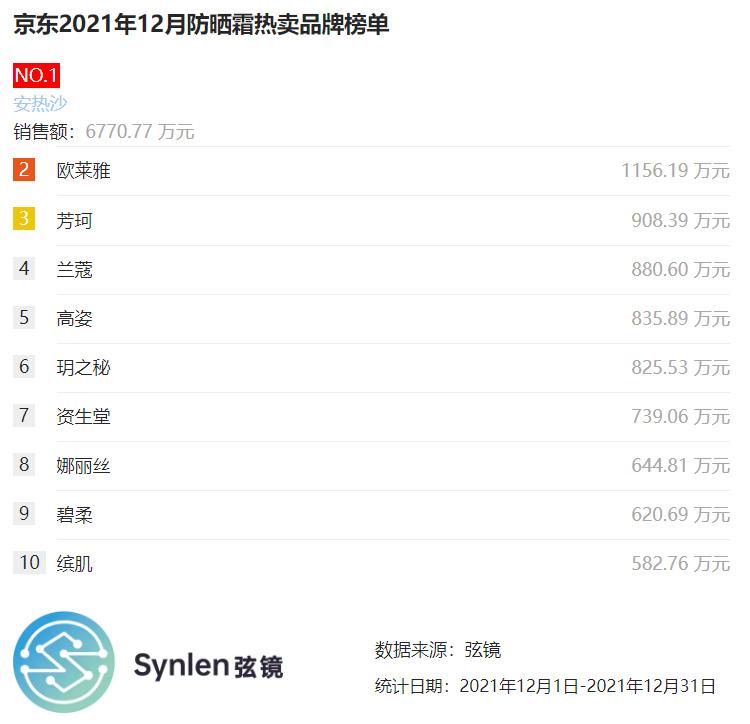 根據(jù)電商數(shù)據(jù)搜索工具——“弦鏡”數(shù)據(jù)顯示,京東平臺12月防曬霜熱賣品牌榜單,第一名安熱沙,銷售額為6770.77萬元。第二名歐萊雅,銷售額為1156.19萬元。第三名芳珂,銷售額為908.39萬元。從第四名到第十名分別為蘭蔻、高姿、玥之秘、資生堂、娜麗絲、碧柔、繽肌。