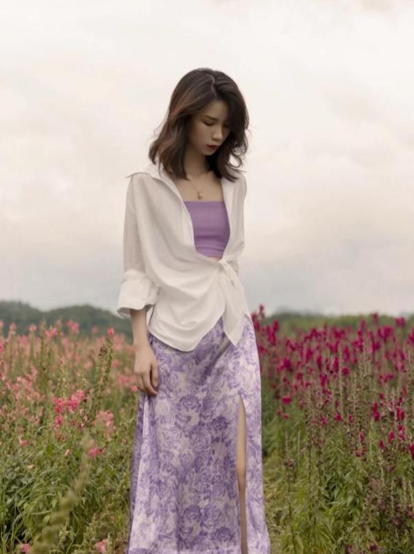 下面是一件高腰半身裙,碎花是夏日連衣裙流行也是百搭的印花圖案,紫色的色調顯得十分優(yōu)雅。高腰設計很顯腿長,拉長身材比例。開衩設計,看起來更有設計感,露出大長腿,若隱若現,顯得更有魅力。