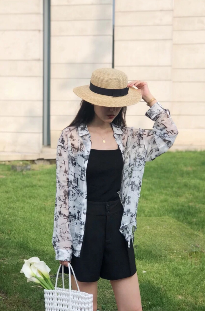 No.4 復古港風寬松印花襯衫+黑色吊帶背心+高腰短褲