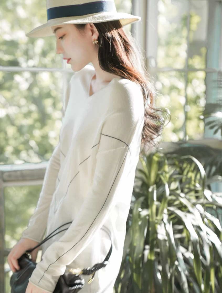 這身防曬穿搭一眼看去很優(yōu)雅又很高級,好看的同時防曬工作也做的很好。長袖針織衫,避免了雙臂被曬,針織面料柔軟透氣,不會感到悶熱。V領的設計也是很顯瘦,露出頸部線條,將女性的柔美展現出來。