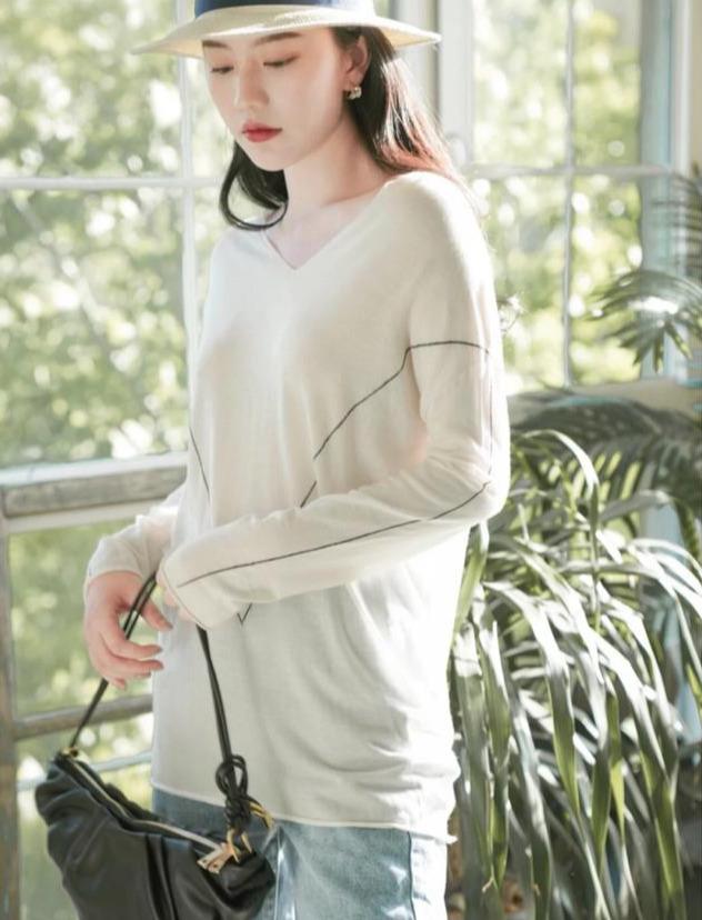 No.1 V領幾何線性針織防曬衫+淺藍色牛仔褲