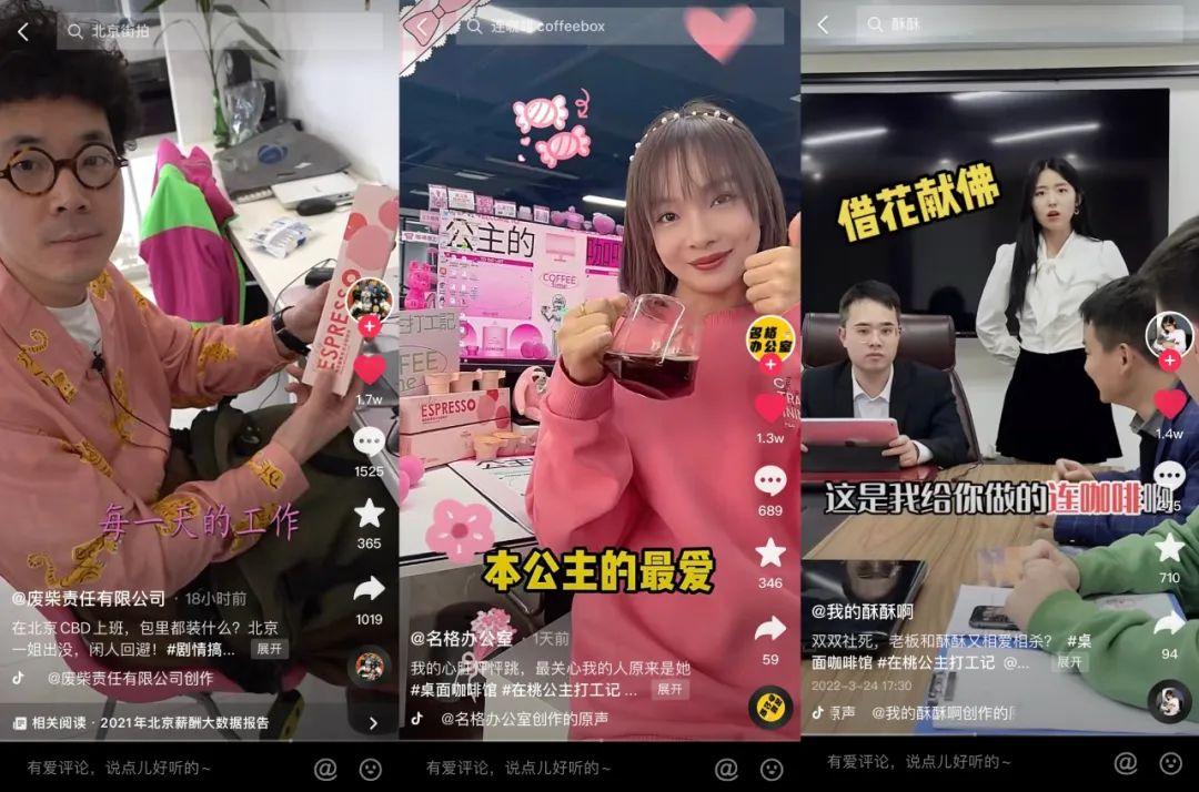 再者是獨具創(chuàng)意的場景化營銷。配合新品和主題,連咖啡在抖音發(fā)起了#在桃公主打工記 話題挑戰(zhàn),邀請抖音垂類達人共創(chuàng)了一系列“公主風工位改造”、“趣味化辦公室劇情”等爆款視頻,將新品植入辦公室場景,形成產(chǎn)品與場景的深度綁定。