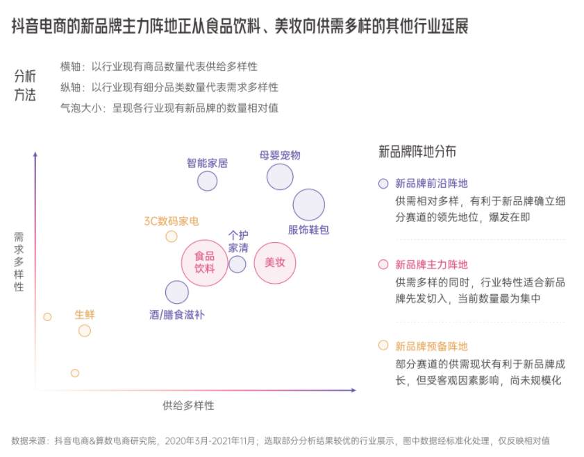 從平臺角度看,《2022抖音電商新品牌成長報告》顯示,2021年抖音上與新品牌直接相關(guān)的用戶搜索內(nèi)容量持續(xù)攀升,新品牌主力陣地正從食品飲料、美妝向供需多樣的其他行業(yè)延展,充足的發(fā)展空間、低入駐門檻、高需求多樣性為新品牌的起勢提供了良好的生長環(huán)境。