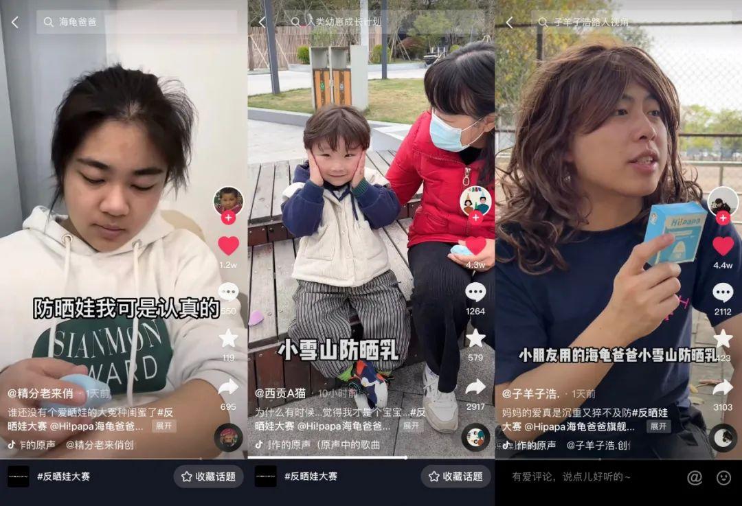 內(nèi)容方面,海龜爸爸重點圍繞其明星產(chǎn)品“貝瑪小雪山兒童防曬”推出了品牌話題#反曬娃大賽。洞悉家長們習慣性“曬娃”的心理,“反曬娃大賽”抓住受眾注意力,激發(fā)用戶分享欲的同時,“反曬娃”與產(chǎn)品主要賣點“兒童防曬”相呼應(yīng),有效提升了品牌的親切感。此外,海龜爸爸也邀請了母嬰、美妝類達人進行內(nèi)容共創(chuàng),輸出趣味劇情、專業(yè)種草視頻,以極具共鳴的內(nèi)容擴大聲量。