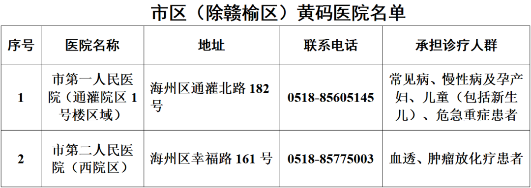 2.市區(qū)(除贛榆區(qū))設(shè)立2家黃碼醫(yī)院,分別為市第一人民醫(yī)院(通灌院區(qū)1號樓區(qū)域)、市第二人民醫(yī)院(西院區(qū))。其中,市第一人民醫(yī)院(通灌院區(qū)1號樓區(qū)域)承擔(dān)常見病、慢性病及孕產(chǎn)婦、兒童(包括新生兒)、危急重癥患者的診療服務(wù);市第二人民醫(yī)院(西院區(qū))承擔(dān)血透、腫瘤放化療患者的診療服務(wù)。