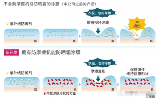 Allie防曬霜有FRICTION記憶型耐摩擦技術(shù),這種技術(shù)的改進(jìn)與花王集團(tuán)開花處特殊的具有彈性記憶的高分子材料有關(guān)。這些材料能幫助防曬霜形成的防曬膜在受到汗水侵蝕和摩擦變形之后,恢復(fù)剛涂抹時(shí)的形狀,保持之前的均勻平滑狀態(tài),從而讓ALLIE防曬霜的防曬性能不受到手帕摩擦等影響,從側(cè)面也是提高了防曬的性能。