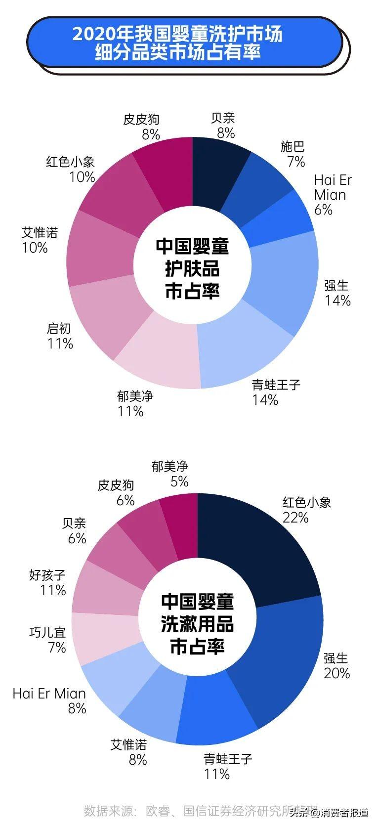 目前我國(guó)嬰幼兒日化市場(chǎng)中海外、本土品牌共存。具有代表性的國(guó)產(chǎn)品牌紅色小象、青蛙王子、啟初、子初、全棉時(shí)代等,近年來(lái)發(fā)展迅猛;海外品牌中,強(qiáng)生與同屬?gòu)?qiáng)生旗下的艾惟諾市場(chǎng)占有率較高,其中強(qiáng)生嬰兒一直以來(lái)均保持市場(chǎng)占有率首位。