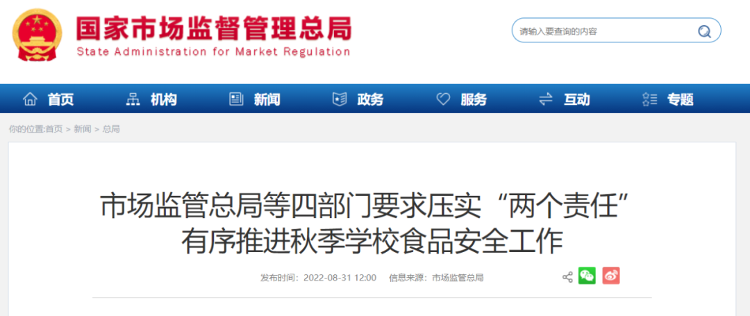 近日,市場監(jiān)管總局辦公廳聯(lián)合教育部辦公廳、衛(wèi)生健康委辦公廳、公安部辦公廳印發(fā)《關于做好2022年秋季學校食品工作的通知》,部署各地有關部門做好秋季學校食品各項工作?!锻ㄖ芬螅M一步健全管理機制,壓緊壓實學校食堂、校外供餐單位主體責任和屬地管理責任,完善末端發(fā)力、終端見效的制度機制,形成一級抓一級、層層抓落實的良好局面。督促學校加強對食堂及承包者或委托經(jīng)營者的日常管理,嚴格落實食品校長(園長)負責制和學校相關負責人陪餐制度。