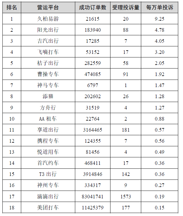 8月31日,上海市交通委發(fā)布了2022年上半年網(wǎng)約車平臺投訴排名。數(shù)據(jù)顯示,上海市交通委受理網(wǎng)約車平臺各類訴求3650件,環(huán)比下降61.75%,平均每萬單投訴為0.23件,環(huán)比下降14.25%。投訴排名前五位的網(wǎng)約車平臺分別是“久柏易游”、“陽光出行”、“吉汽出行”、“飛嘀打車”和“桔子出行”。