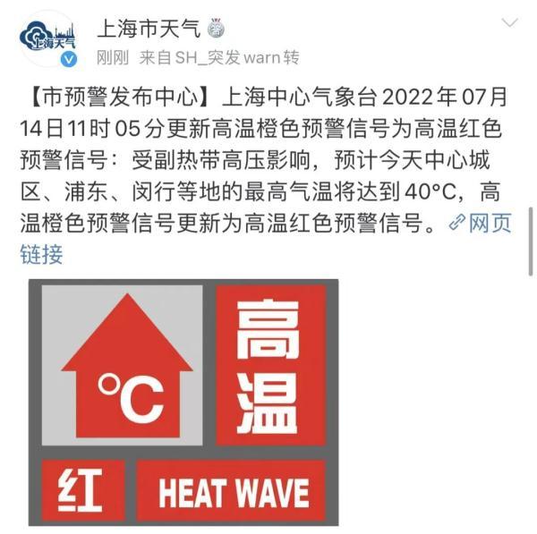 上海中心氣象臺2022年07月14日11時05分更新高溫橙色預(yù)警信號為高溫紅色預(yù)警信號:受副熱帶高壓影響,預(yù)計今天中心城區(qū)、浦東、閔行等地的高氣溫將達到40℃。
