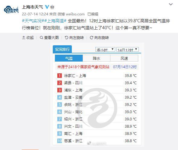 上海徐家匯站以39.8℃