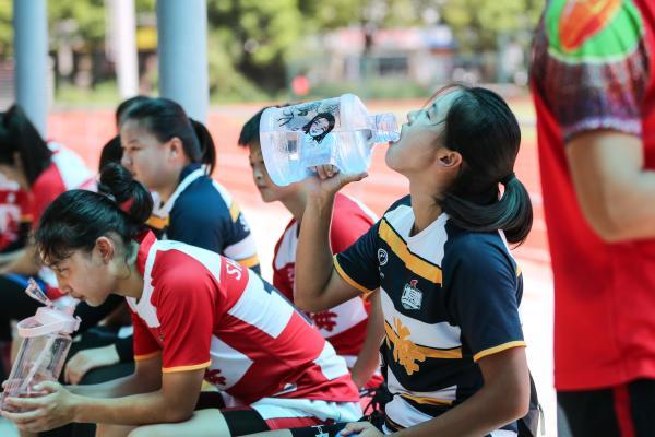 訓練間隙,球員們大口喝水。