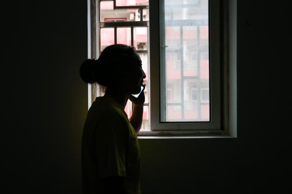 結(jié)束一天的訓練,隊員在寢室過道給家人打電話,聽到家人的鼓勵露出幸福的笑容。