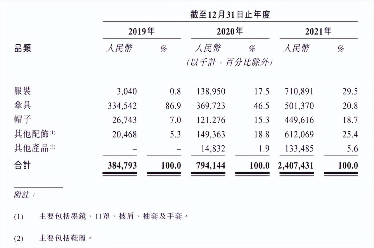 具體而言,蕉下的營收中,傘具的占比逐年下降,2019年到2021年分別為86.9%、46.5%和20.8%,服飾品類和配飾系列比重在連年攀升,2019年,二者占比分別為0.8%和5.3%,到了2021年則達(dá)到了29.5%和25.4%,成為兩大支柱品類。