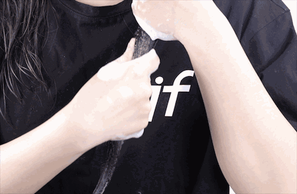 2、充分按摩放松頭皮后,將手指從發(fā)間自上而下捋順,同時以泡沫按摩發(fā)絲。
