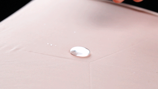 水珠接觸傘面形成無(wú)法滲入的“球狀水珠”,就像水珠落在荷葉上一樣。