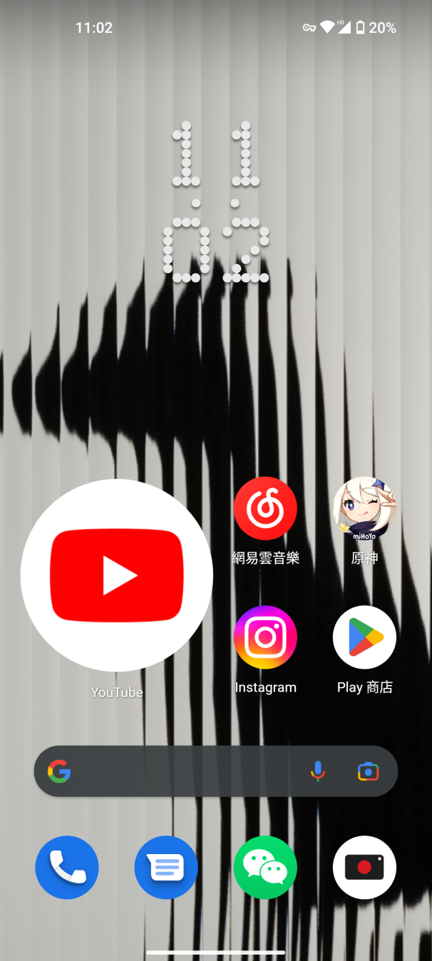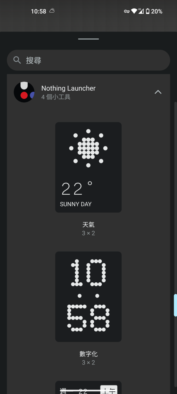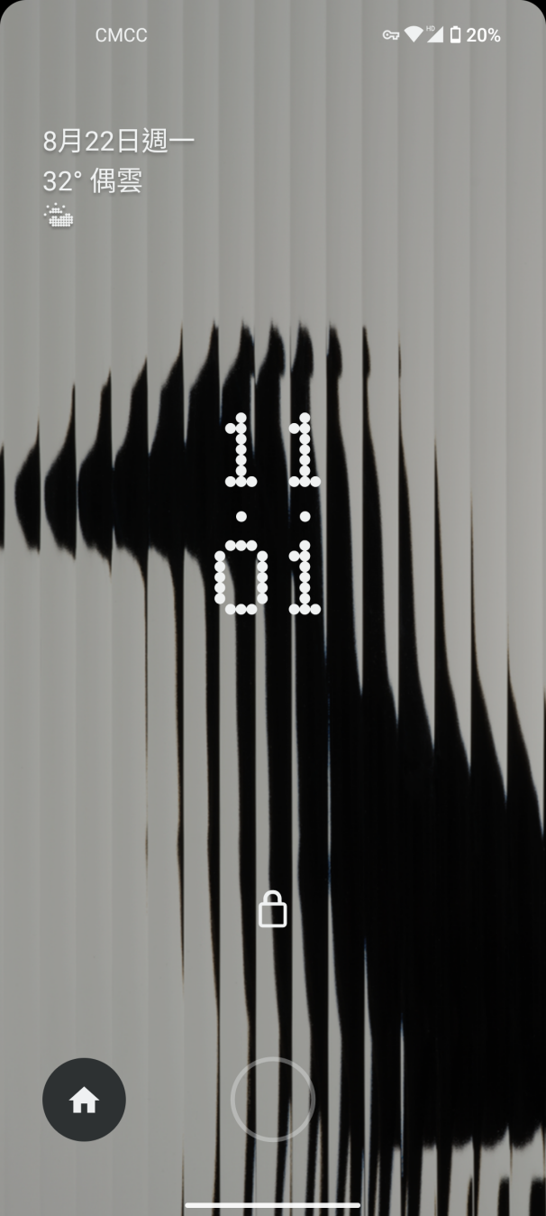 點陣字體作為Nothing的主要特色,在NothingOS中當(dāng)然也不會錯過。在主屏幕和鎖屏界面中,中間的時鐘以及左上角的日期天氣信息上,均能看到點陣字體的元素。但目前看來,該點陣字體暫時還沒適配所有字體。在簡體中文和繁體中文中,部分點陣字體出現(xiàn)無法正常顯示的情況。