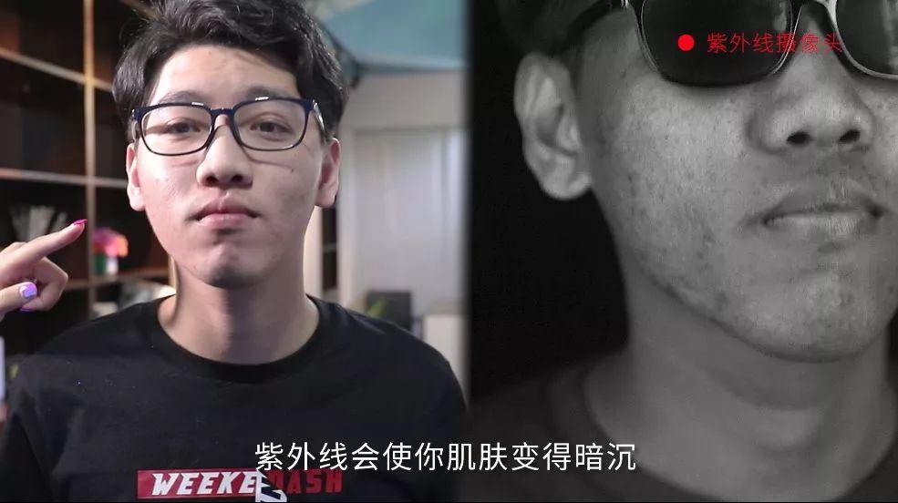 紫外線鏡頭下,涂抹防曬液后全臉變黑,表示紫外線無(wú)法穿透