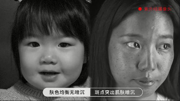 下面是一位小朋友和一位二十幾歲成年女性,在紫外線鏡頭下做的對(duì)比,前者白玉無(wú)瑕,后者有的暗沉、斑點(diǎn)臉,兩者形成強(qiáng)烈對(duì)比。