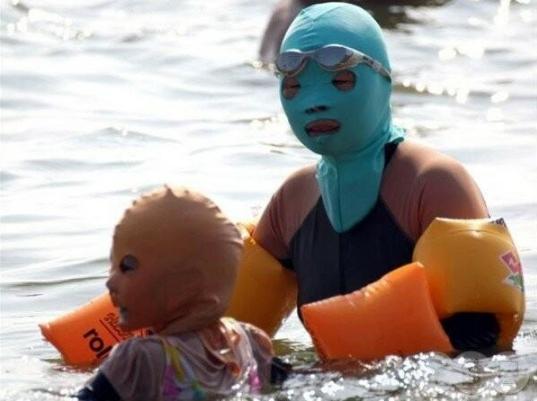 而近幾年有一種防曬套裝直接減輕了許多中國游客的負擔(dān),這是一種臉部泳衣,其實就是一個橡膠的面具。大家看圖應(yīng)該就能明白這東西是用來保護頭部不被太陽照射的。而也就是這樣的東西讓歐洲人感覺莫名其妙,他們覺得中國人為了躲避太陽的照射真的是想盡各種辦法。