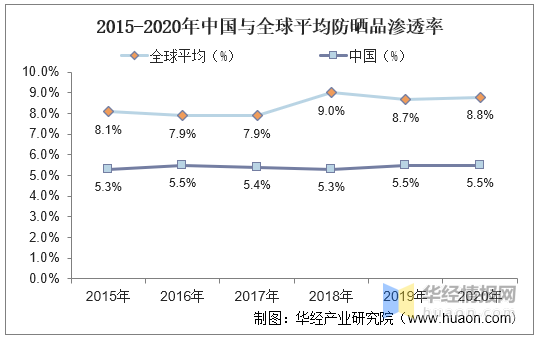 我國由于起步較晚,目前仍處于發(fā)展初期,滲透率(防曬化妝品占護膚品市場規(guī)模的比例)仍較低。據(jù)統(tǒng)計,2015年以來,我國防曬品滲透率穩(wěn)定在5.5%左右,低于平均水平。2020年我國防曬品滲透率為5.5%,低于平均的8.8%,仍有較大提升空間。