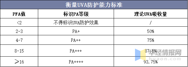 一般而言,以SPF值衡量UVB的防護能力,以PA等級衡量UVA的防護能力。以PA等級衡量UVA的防護能力,體現(xiàn)產(chǎn)品防曬黑、防老化能力。各國對PA等級的測定標準有所不同。在UVA防護能力的測定標準上,中國和日本采用PFA值來測定PA等級,歐美采用PPD值(PPD的衡量標準與PFA相似),美國和加拿大則采用“廣譜防護”來表示(若臨界波長≥370nm,則產(chǎn)品可宣稱提供“廣譜防護”,可產(chǎn)品上可標注“BroadSpectrum”)。