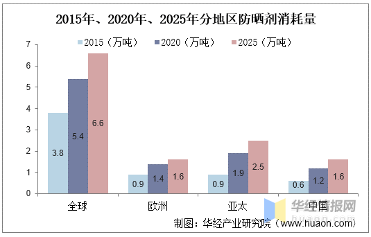 2015年、2020年、2025年分地區(qū)防曬劑消耗量