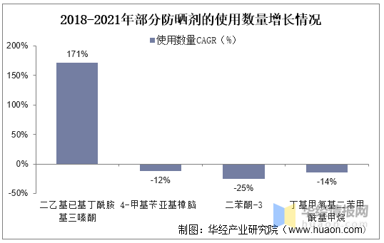 2018-2021年部分防曬劑的使用數(shù)量增長情況