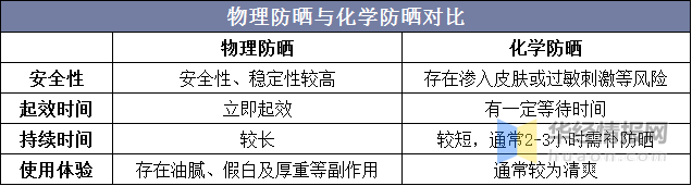 防曬指為防止皮膚曬傷、曬黑,而采取一定方法阻隔或吸收紫外線的行為。根據(jù)方式的不同,防曬霜可分為物理防曬與化學防曬兩類。其中,物理防曬通過物理遮蓋的方式,阻擋、反射或散射紫外線,減少到達皮膚的紫外線量,性較高,但同時使用后會產(chǎn)生皮膚油膩、假白等副作用;化學防曬通過吸收紫外線達到防曬果,使用體驗較為清爽,但伴有滲入皮膚或過敏等風險。