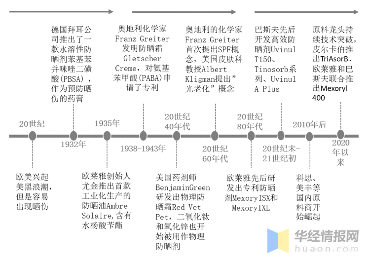 世界防曬劑自20世紀30年代以來快速發(fā)展,由于歐美對于美黑的熱潮,初的防曬劑主要是防UVB,用于在美黑的同時防曬傷。隨著對于防UVA和物理防曬劑認識的提升,各類防曬劑類型不斷豐富。20世紀80年代以來,多款具有更高能的防曬劑(例如更高防護能力、覆蓋波段更廣、更強穩(wěn)定性、更強相容性、更大分子量)相繼面世。在巴斯夫、帝斯曼、歐萊雅等龍頭原料商引領下,防曬劑技術得到不斷突破。