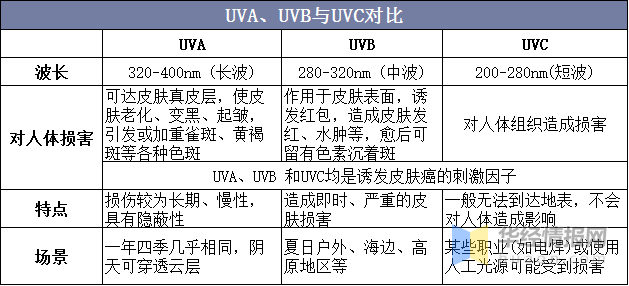 根據(jù)波長及對人體影響的不同,紫外線可分為三個波段,分別為長波紫外線(UVA)、中波紫外線(UVB)和短波紫外線(UVC)。其中,UVC無法穿過臭氧層,一般不會對人體造成損害;UVA穿透力較強,可深入皮膚層,使皮膚老化、變黑、起皺,引發(fā)色斑;而UVB則作用于皮膚表面,會誘發(fā)紅斑,也是非黑癌性皮膚癌的刺激因子。此前,傳統(tǒng)防曬主要關注會造成即時、嚴重皮膚損害的UVB,而忽略影響較為慢性的UVA。隨著消費者對于UVA認知的提升,兼具防御UVB與UVA功能的廣譜防曬產(chǎn)品更受青睞。
