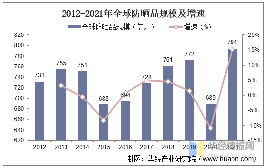據(jù)統(tǒng)計,2021年防曬品規(guī)模達794億元,市場規(guī)模較大,與2020年相比增長速度較快;2012年-2021年CAGR為0.9%。