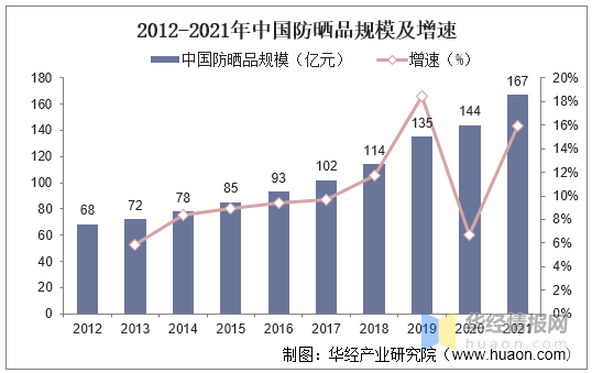 數(shù)據(jù)顯示,2012-2021年中國防曬品市場規(guī)模呈現(xiàn)逐年上漲趨勢,10年間CAGR為10.5%,2021年市場規(guī)模達167億元。中國防曬品規(guī)模增速遠超,防曬品需求景氣度較高。