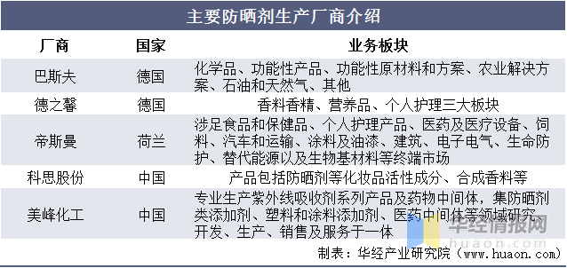 防曬劑主要廠商包括巴斯夫、德之馨、帝斯曼、科思股份和美峰化工,國內(nèi)龍頭正處于由代工向品牌化轉變階段。巴斯夫是老牌德國化工企業(yè),是世界上工廠面積大的化學產(chǎn)品基地。集團在歐洲、亞洲、南北美洲的41個擁有超過160家全資子公司或者合資公司??扑脊煞莺兔婪寤ぞ鶠閲鴥?nèi)防曬劑原料企業(yè),其中科思股份份額領先,美峰化工憑借相對低廉的價格在亞太地區(qū)有不錯的市占率。
