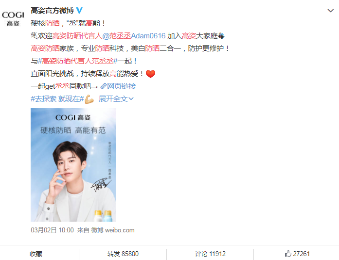 3月2日,高姿品牌在其官方微博發(fā)文:“硬核防曬,‘丞’就高能。與#高姿防曬代言人范丞丞#一起,直面陽(yáng)光挑戰(zhàn)......”同一天,日本品牌娜麗絲官方微博也宣布鄧倫為娜麗絲Parasola防曬品牌新代言人。