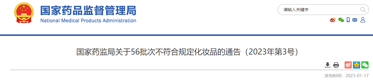 中國質(zhì)量新聞網(wǎng)訊 2023年1月17日,藥監(jiān)局網(wǎng)站發(fā)布關(guān)于56批次不符合規(guī)定化妝品的通告(2023年第3號)。通告稱,在2022年化妝品監(jiān)督抽檢工作中,經(jīng)廣東省藥品檢驗所等單位檢驗,產(chǎn)品標(biāo)簽標(biāo)示為廣州市三榮化妝品有限公司生產(chǎn)的威品染發(fā)膏(咖啡色)等56批次化妝品(含牙膏,下同)不符合規(guī)定。
