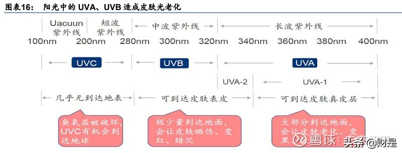 UVA 和 UAB 是光老化的主要“元兇“,化學(xué)防曬和物理防曬是兩種主要防曬手段。在到 達(dá)地球表面的紫外線輻射中,超過 95%是波長較長的 UVA,剩下的只有少量 UVB,幾乎 沒有 UVC 到達(dá)。UVA 波長 320-400nm,間接損害皮膚 DNA,并會(huì)使得皮膚快速曬黑; UVB 波長 280-320nm,大部分被臭氧層吸收,但會(huì)導(dǎo)致直接的 DNA 損傷,使皮膚曬傷、紅腫、脫皮。物理防曬和化學(xué)防曬的作用原理不同,物理防曬劑主要靠分子在皮膚表面形 成保護(hù)膜,通過反射或散射紫外線來減少對(duì)皮膚的傷害,優(yōu)點(diǎn)為防護(hù)能力強(qiáng)、效果持久, 缺點(diǎn)為易泛白、粘膩;化學(xué)防曬劑通過吸收有害的紫外線實(shí)現(xiàn)防曬,優(yōu)點(diǎn)為一般質(zhì)地相對(duì) 輕薄,缺點(diǎn)為通常需要多個(gè)防曬劑品種疊加使用、可能對(duì)皮膚造成敏感、防曬時(shí)間有限制。