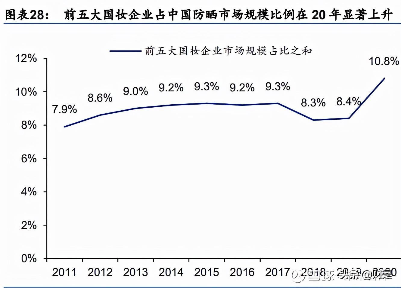 近年來防曬成為國妝企業(yè)打造明星單品的重要突圍方向。過往來看,防曬市場(chǎng)以外資品牌 主導(dǎo),據(jù) Euromonitor,13-19 年前五大外資企業(yè)占中國防曬市場(chǎng)規(guī)模比例之和均維持在 45%以上,而 11-19 年前五大國妝企業(yè)占比之和均在 10%以下。20 年外資企業(yè)受疫情影 響生產(chǎn)、貿(mào)易受阻,占比之和下滑至 41.5%。伴隨國內(nèi)防曬市場(chǎng)景氣度抬升,國妝企業(yè)紛 紛布局防曬賽道:珀萊雅于 21 年 1 月新推出的羽感防曬主要面向年輕白領(lǐng)女性群體,憑 借廣譜防護(hù)、抵御藍(lán)光、養(yǎng)膚抗污染等亮點(diǎn),以及全渠道布局、精細(xì)化流量等形式成功打 造大單品,截至 2022.1 的 12 個(gè)月內(nèi)天貓累計(jì)銷售額達(dá) 97.53 百萬元,占同期天貓防曬霜 行業(yè)整體銷售額的 2.35%;薇諾娜以敏感肌護(hù)理為核心定位,15 年推出的清透防曬乳填補(bǔ) 了敏感肌防曬市場(chǎng)的空白,并于 20 年在天貓金妝獎(jiǎng)上入圍“年度佳防曬”。