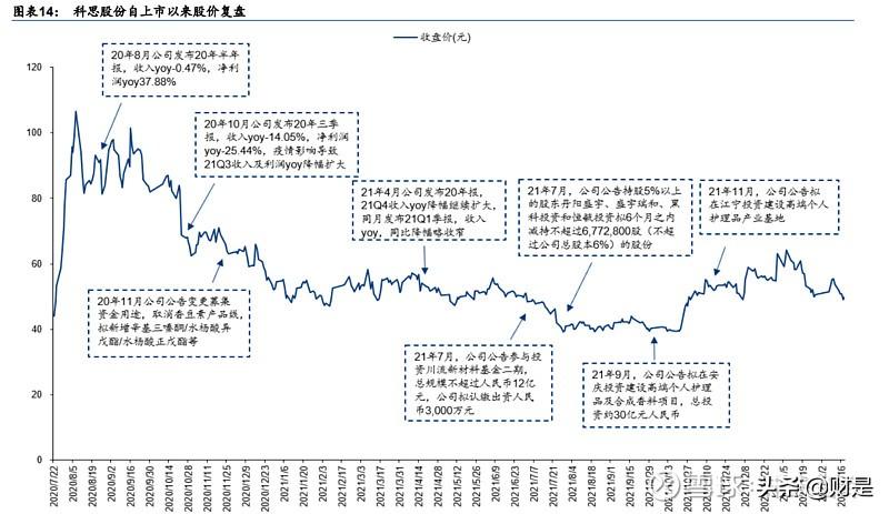 江寧、安慶開發(fā)區(qū)投資項(xiàng)目打開中長期發(fā)展天花板。公司在 21 年 9 月和 11 月分別簽訂協(xié) 議,擬在安慶開發(fā)區(qū)和江寧開發(fā)區(qū)投資建設(shè)高端個(gè)人護(hù)理品及合成香料項(xiàng)目和“高端個(gè)人 護(hù)理品產(chǎn)業(yè)基地”,項(xiàng)目總投資分別為約 30 億元和不低于 5 億元人民幣。其中安慶項(xiàng)目將 作為公司未來 10 年的產(chǎn)能規(guī)劃地,據(jù)公司預(yù)計(jì),項(xiàng)目將于 24 年下半年一期投產(chǎn),總產(chǎn)能 9.5 萬噸,按擬生產(chǎn)的每種產(chǎn)品產(chǎn)量占市場(chǎng)份額 30%的目標(biāo)計(jì)算,公司預(yù)計(jì)項(xiàng)目達(dá)產(chǎn)后年 產(chǎn)值約 43 億元。這兩項(xiàng)大規(guī)模的新建投資項(xiàng)目有利于進(jìn)一步提升公司競爭力,促進(jìn)公司 的中長期可持續(xù)發(fā)展。