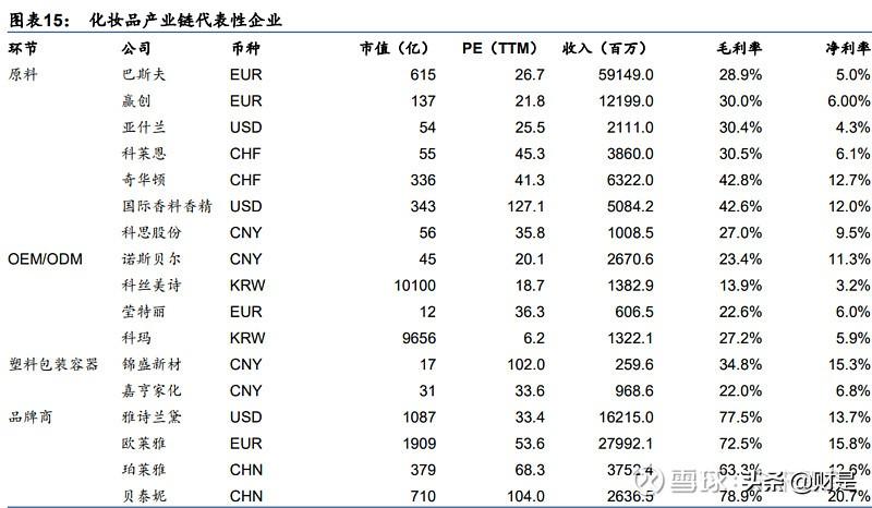 日化原料市場(chǎng)空間廣闊、國際龍頭有較高天花板原料是決定化妝品功效差異化的重要環(huán)節(jié),防曬劑是化妝品原料中的佳賽道之一。獨(dú)特 活性成分是品牌商的重要名片。防曬劑含量占比高、監(jiān)管體系相對(duì)嚴(yán)格、持續(xù)升級(jí)迭 代,是化妝品原料佳賽道之一。合成香料市場(chǎng)大而分散,海外龍頭壟斷高端市場(chǎng),國內(nèi) 企業(yè)在細(xì)分領(lǐng)域、細(xì)分品種有生產(chǎn)規(guī)模優(yōu)勢(shì)。過往國際巨頭引領(lǐng)創(chuàng)新,國內(nèi)原料供應(yīng)商以 me too 品種、價(jià)格優(yōu)勢(shì)搶占中低端市場(chǎng)。國妝奮起時(shí),品牌興有望帶動(dòng)上游強(qiáng),疫情/專 利/政策/資本有望加速產(chǎn)能轉(zhuǎn)移進(jìn)程,中國原料商有望崛起。