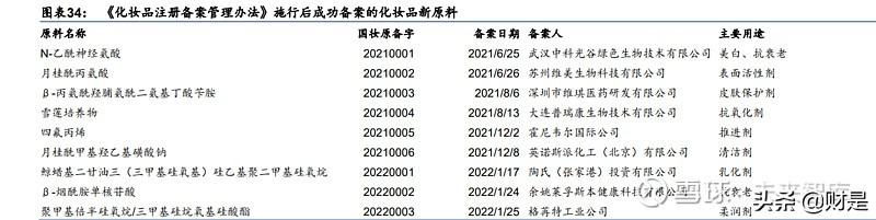 3)政策:市場(chǎng)監(jiān)督管理總局頒布的《化妝品注冊(cè)備案管理辦法》自 2021 年 5 月 1 日 起施行。條例規(guī)定申請(qǐng)注冊(cè)具有防腐、防曬、著色、染發(fā)、祛斑美白功能的化妝品新原料, 應(yīng)當(dāng)按照藥品監(jiān)督管理局要求提交申請(qǐng)資料;并對(duì)已經(jīng)取得注冊(cè)、完成備案的化妝品 新原料實(shí)行為期 3 年的監(jiān)測(cè)制度。政策加速新原料注冊(cè)備案流程,從源頭激發(fā)化妝品 行業(yè)創(chuàng)新。據(jù)藥監(jiān)局官網(wǎng),自新規(guī)施行至 2022.2,已有 9 種化妝品新原料成功備案, 而在 2009-2019 年十年間我國獲批的化妝品新原料僅 4 個(gè),原料備案迎來加速期。
