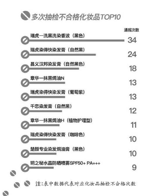 剔除200多批次監(jiān)管部門認定的假冒產(chǎn)品,其余不合格化妝品共有1600多批次。其中,標稱“廣東瑞虎精細化工有限公司”的瑞虎一洗黑洗染香波(黑色)被通報34次,上榜次數(shù)多;標稱該公司另一款產(chǎn)品瑞虎染得快染發(fā)膏(自然黑)被通報24次,排在第二位;“廣州市漢邦化妝品有限公司”的昌義漢邦染發(fā)膏(自然黑色)被通報18次,位列第三。