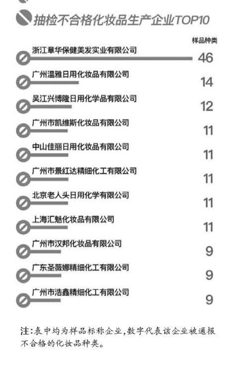 南都大數(shù)據(jù)研究院統(tǒng)計發(fā)現(xiàn),這1600多批次不合格化妝品標稱來自400多家生產(chǎn)企業(yè),其中標稱“浙江章華保健美發(fā)實業(yè)有限公司”的不合格化妝品種類多,包括“章華一抹黑焗油”、“天峰染發(fā)焗油”、“章華生態(tài)焗油染發(fā)霜”等40多款染發(fā)燙發(fā)類化妝品。此外,“廣州溫雅日用化妝品有限公司”有14款產(chǎn)品,“吳江興博隆日用化學(xué)品有限公司”有12款產(chǎn)品上榜,分列二、三位。